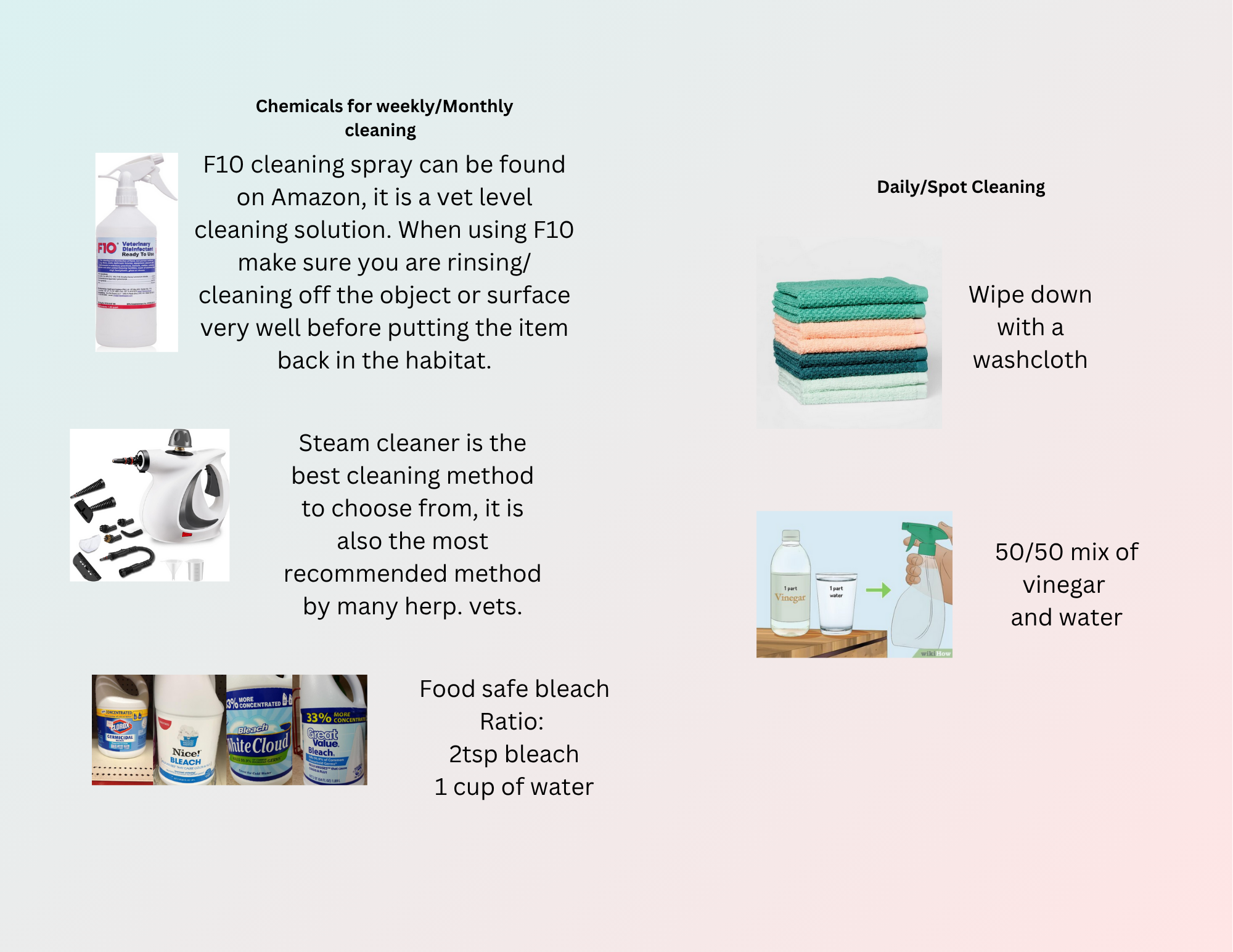 Make sure you spot clean the vivarium daily and deep clean the vivarium weekly/monthly.
