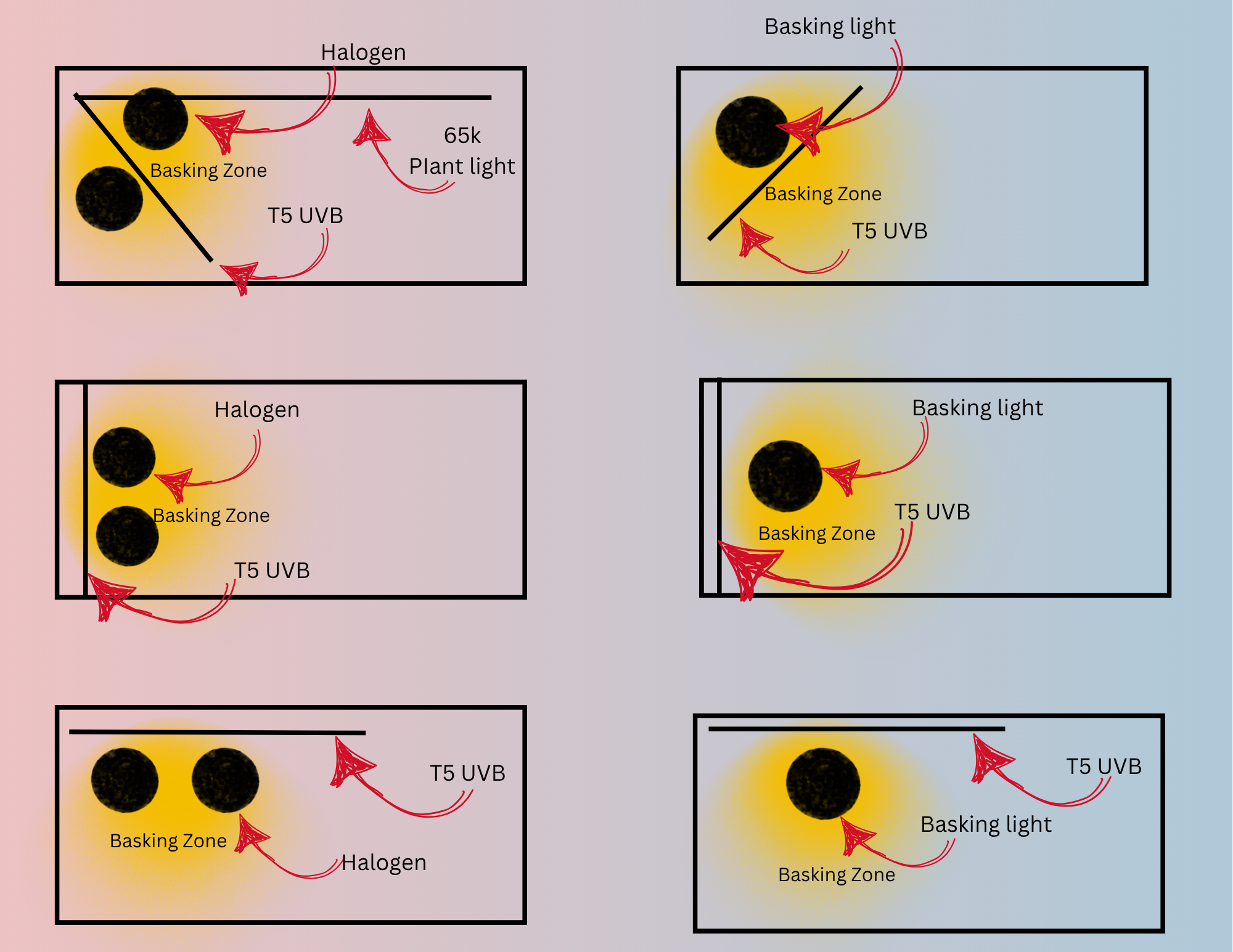 It is important to ensure you have the proper set up for you vivarium, including your light placements. Here is a graphic of some of the different placements you can choose from